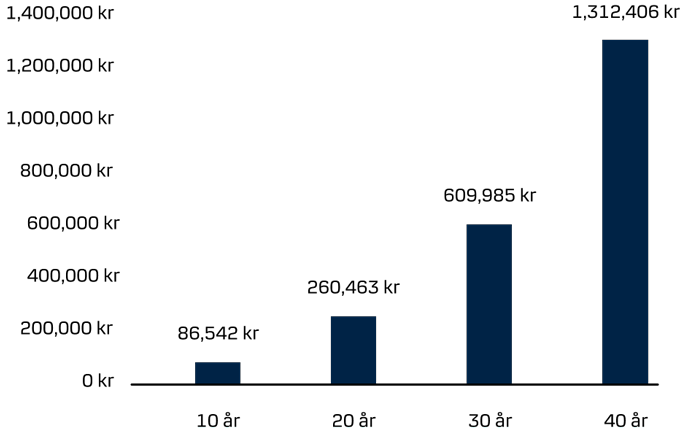 Vi har räknat med 7 % årlig avkastning. Som referens har vi använt det globala indexet MSCI All Country World Index i SEK som under 25-årsperioden från 1 januari 2000 till 31 december 2024 hade en årlig genomsnittlig avkastning på 7,2 %. Källa: Macrobond. Skatter, avgifter och inflation har ej tagits med i uträkningen. Observera att de pengar du placerar både kan öka och minska i värde och att det inte är säkert att du får tillbaka hela det insatta kapitalet.